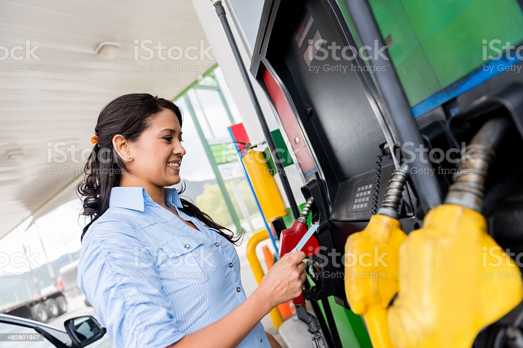 Woman at the gas station paying with credit card