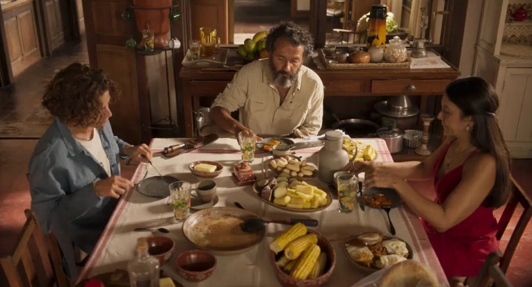 “Bom, eu vou lá buscar a tia Irma e a Dona Mariana. Vou pegar o sal e trazer os instrumentos de pesca que o senhor pediu também, pai”, comentou Joventino. “Tá certo, filho respondeu o ex-marido de Madelaine (Karine Teles). Curiosa, Filó mudou o rumo da conversa e questionou ao enteado sobre uma possível permanência da dama da sociedade carioca no Mato Grosso do Sul.