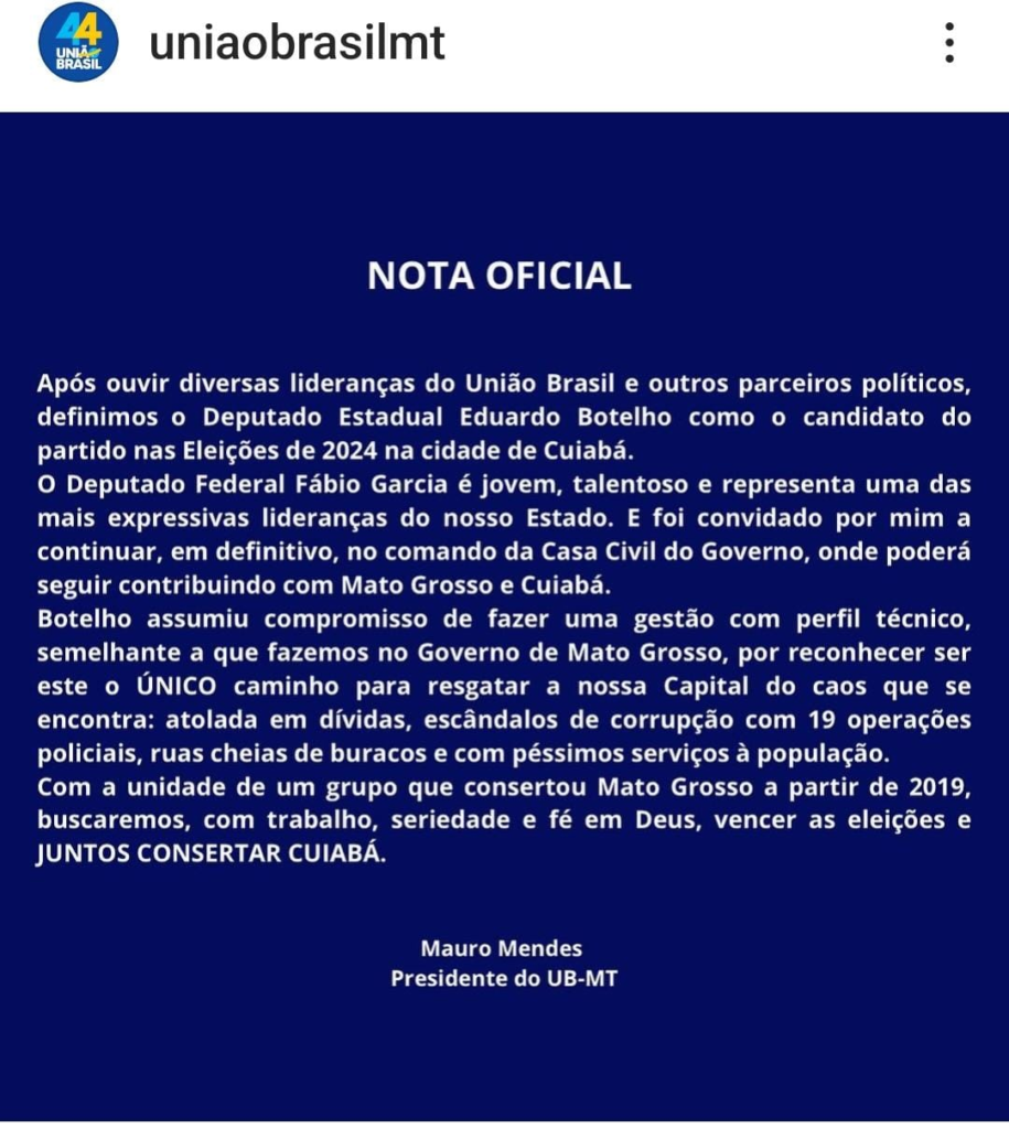 A nota abaixo ressalta os méritos do Deputado Federal Fábio Garcia, mas os pedidos, pesquisas e opções apontavam Botelho