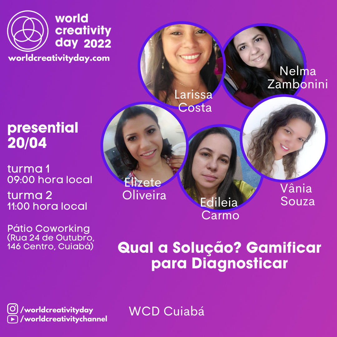 Confira a programação global para o World Creativity Day: www.worldcreativityday.com Outras informações pelo e-mail vaez.carolis@gmail.com ou telefone (65) 98128-4098.