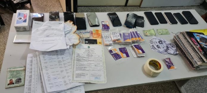 Foram apreendidos na casa uma máquina de cartão, 15 aparelhos celulares, seis cadernos com anotações e dados de possíveis vítimas, 92 chips de telefonia celular ainda intactos e outros 17 chips usados.