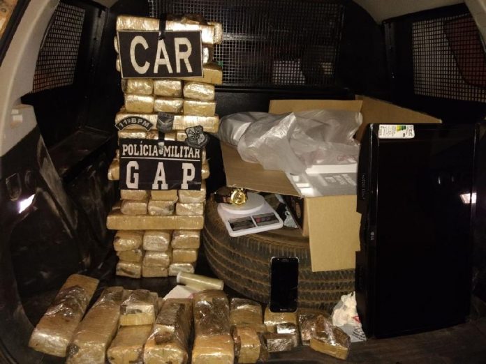 Militares do Grupo de Apoio (GAP) local auxiliaram nas buscas pelo local. No fundo do imóvel, um buraco foi localizado pelos militares com 50 tabletes de maconha, balança de precisão e diversos materiais utilizados para embalagem e comercialização do entorpecente.