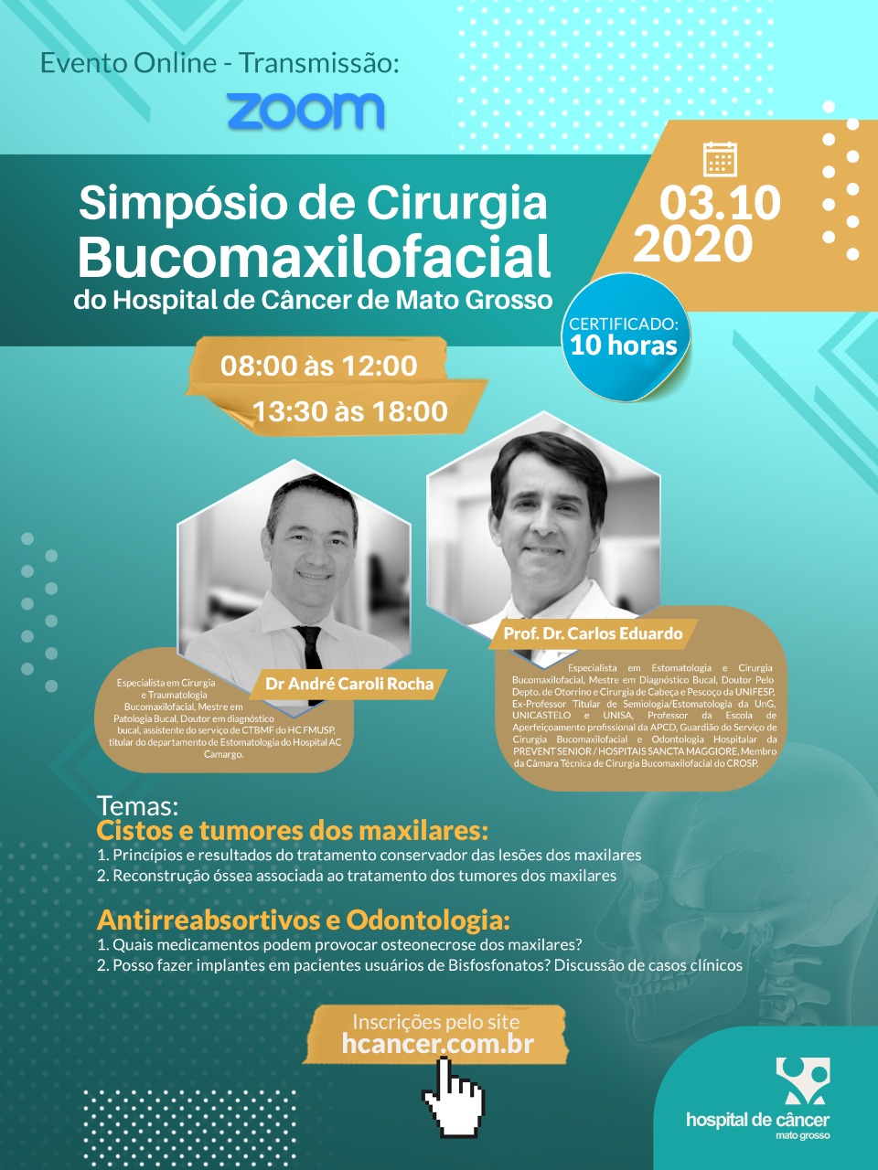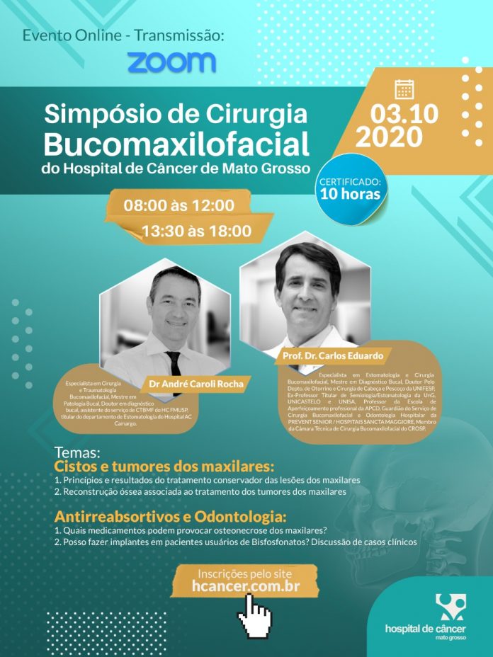 O Núcleo de Integração de Ensino, Pesquisa e Saúde (Nieps) do Hospital de Câncer de Mato Grosso (HCanMT) promoverá o Simpósio de Cirurgia Bucomaxilofacial no dia 03 de outubro. O evento será transmitido pela plataforma online Zoom das 8h às 12h e 13h30 às 18h.