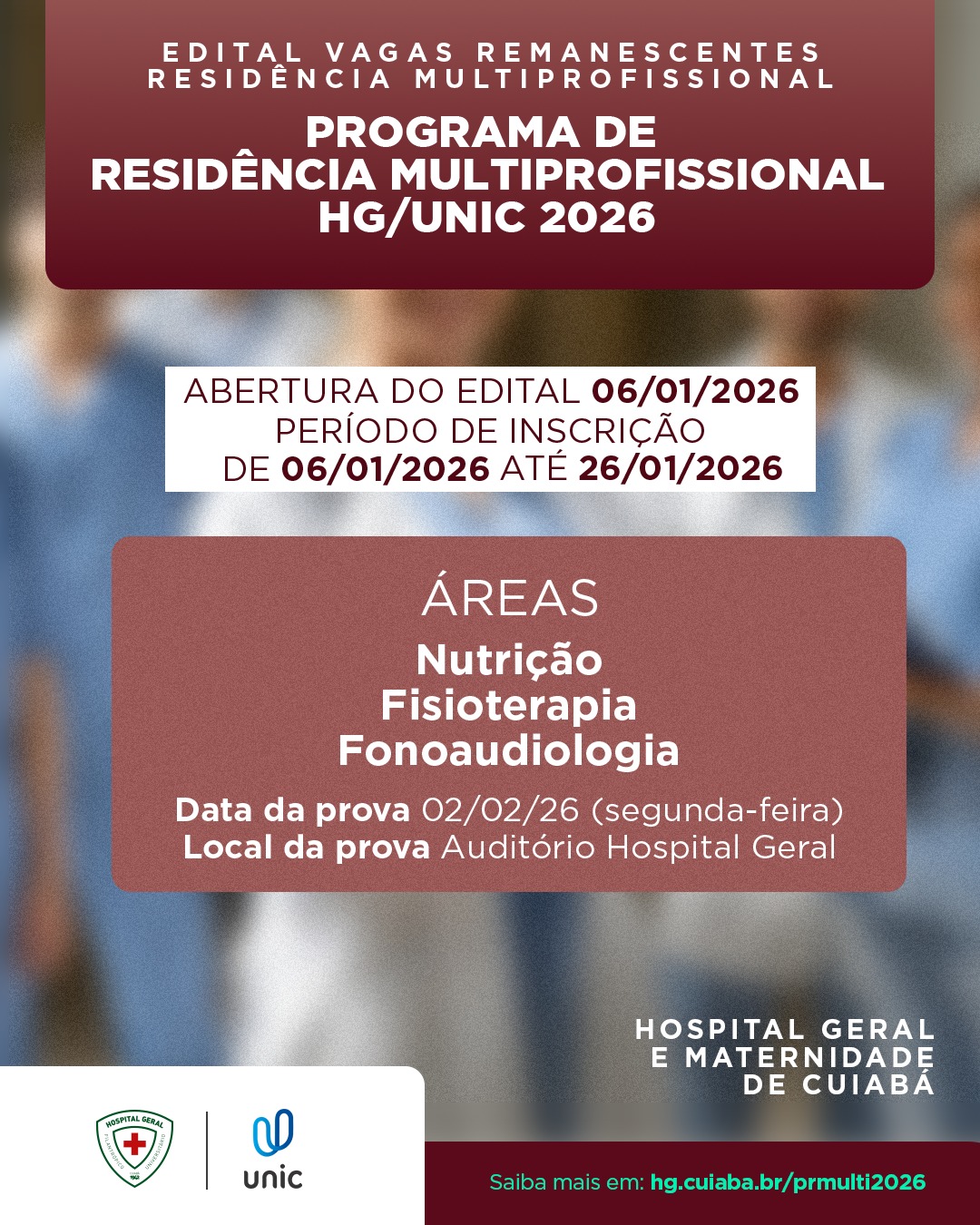 As inscrições seguem abertas até o dia 26 de janeiro de 2026 e devem ser realizadas exclusivamente por meio do link: https://hg.cuiaba.br/prmulti2026, onde também estão disponíveis todas as informações referentes à documentação exigida, taxas e etapas do processo seletivo.