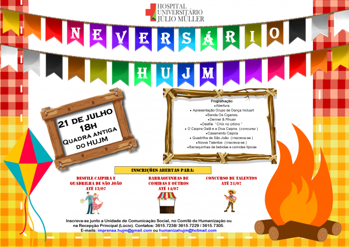A festa julina do HUJM será nesta sexta-feira (21), a partir das 18h na antiga quadra de esportes, terá várias atrações e comida típica, além da divertida dança participe
