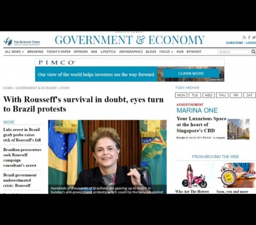 O site do "The Bussiness Times", de Singapura, traz no título: "Com dúvidas sobre a sobrevivência de Dilma, os olhos se voltam para os protestos", além de destacar outras notícias sobre a prisão preventiva de Lula e as investigações da Operação da Lava Jato.