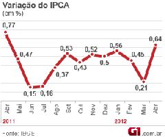 O Índice de Preços ao Consumidor Amplo (IPCA), que mede a inflação oficial do país usada como base para as metas do governo, acelerou de 0,21% em março para 0,64% em abril, segundo informou, nesta quarta-feira (9), o Instituto Brasileiro de Geografia e Estatística (IBGE). Esse foi o maior índice mensal desde abril de 2011, quando o indicador havia ficado em 0,77%. No ano, o IPCA acumula alta de 1,87% e, em 12 meses, de 5,10%.