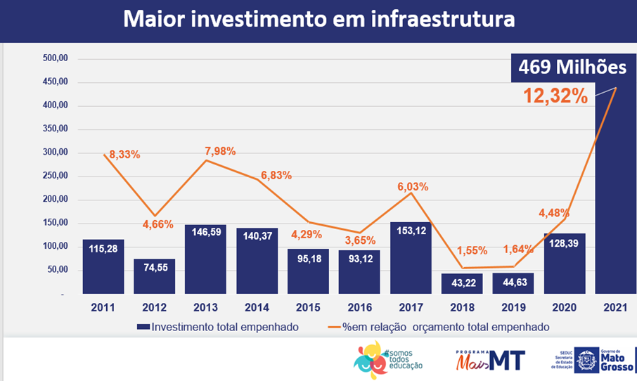 Somente em obras de reformas, manutenção, mobiliário e construção de novas escolas estaduais, em 2021, o Governo de Mato Grosso investiu R$ 469 milhões. Conforme levantamento da Secretaria Adjunta de Gestão Educacional (Sage), este número representa uma diferença e aumento de mais de R$ 300 milhões em relação ao ano de 2011 quando o número de investimentos foi de R$ 115,28 milhões.