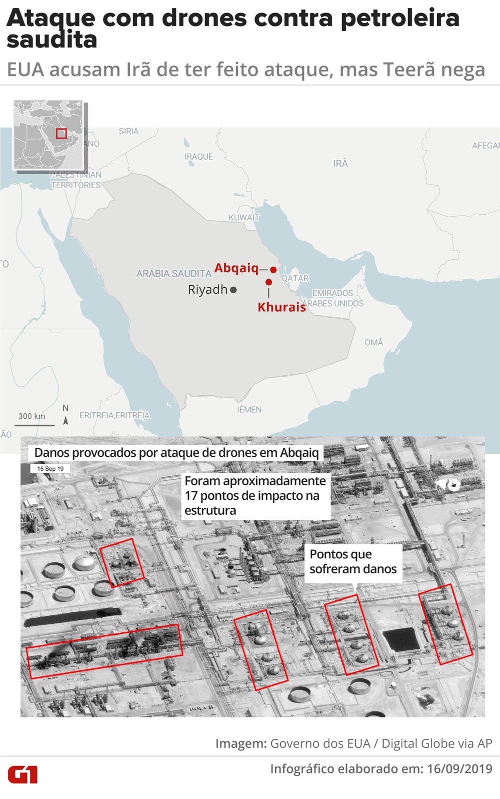 Os ataques interromperam do sábado (14) a produção de 5,7 milhões de barris de petróleo por dia – equivalente a mais da metade dos 9,6 milhões produzidos diariamente segundo a agência Associated Press e 5% da produção mundial.