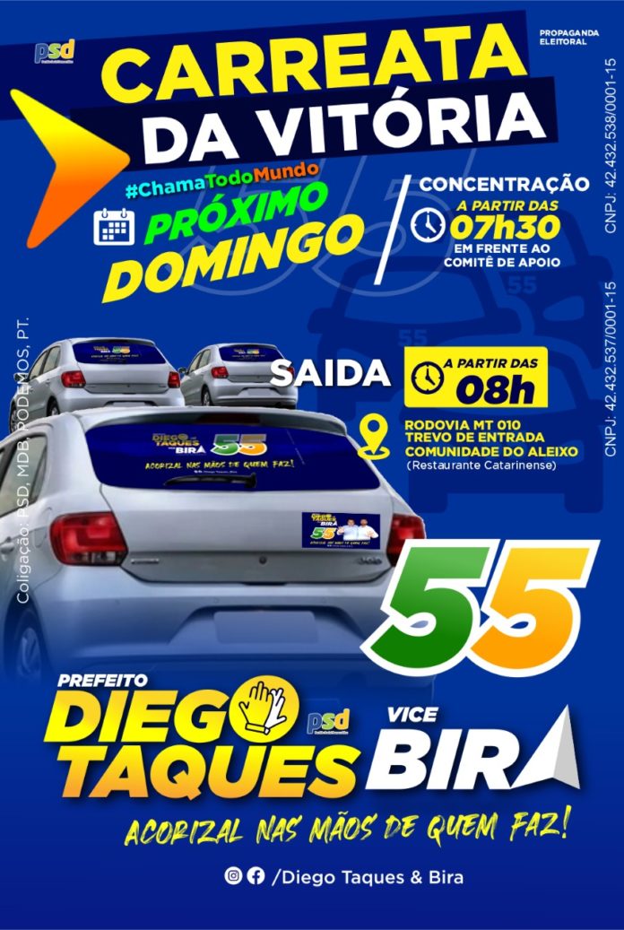 O movimento a cada dia que se passa, só vem aumentando o número de participantes, o que deixa a entender que o mesmo vem conseguindo convencer os demais eleitores, que as propostas de Diego Taques e seu grupo tem com a cidade é a melhor e merecem ganhar as eleições.