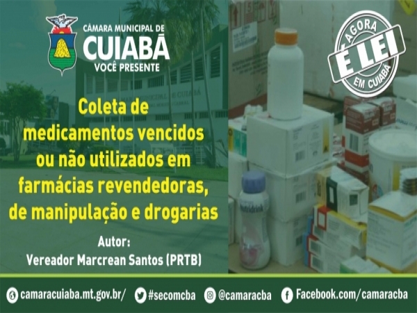 Neste mês, em que é celebrado o “Meio Ambiente”, a Câmara Municipal de Cuiabá destaca a Lei nº 5.678/13, que trata sobre o descarte de medicamentos vencidos em locais apropriados em Cuiabá, de autoria do vereador Marcrean Santos.