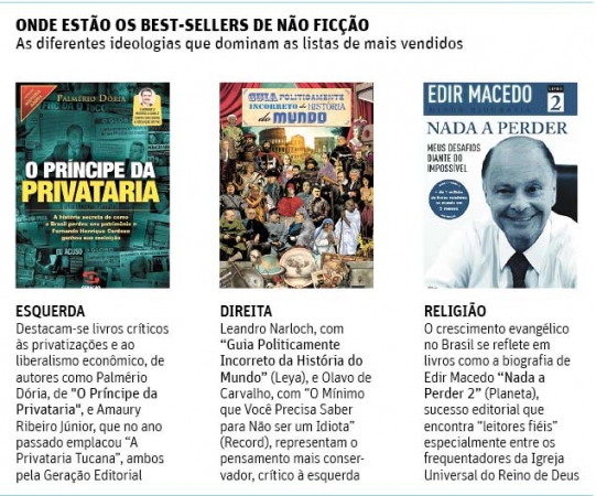 Ligados à direita estão o jornalista Leandro Narloch, autor de "Guia Politicamente Incorreto da História do Mundo" (Leya), que ocupa a quinta posição no ranking de não ficção da revista "Veja", e o filósofo Olavo de Carvalho, com "O Mínimo que Você Precisa Saber para Não ser um Idiota" (Record), em quarto.