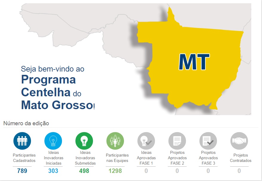 Encerrou com sucesso as inscrições para o Programa Centelha em Mato Grosso, com mais de 1200 participantes cadastrados e 498 idéias Inovadoras submetidas. O programa tem objetivo desenvolver e disseminar a cultura do empreendedorismo inovador e acelerar a geração de novos empreendimentos de base tecnológica.