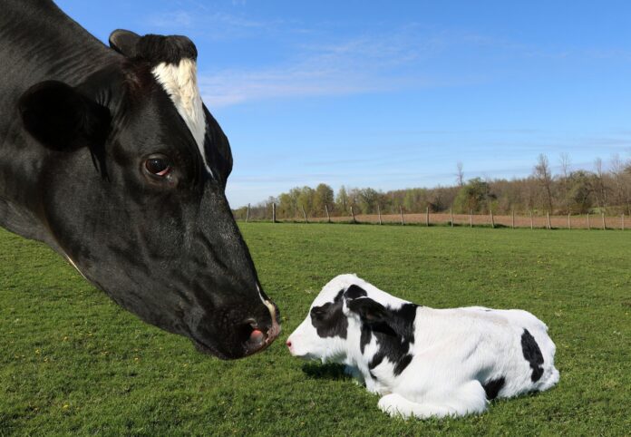 A closeup shot of a mother cow with an adorable calf in a grassy field