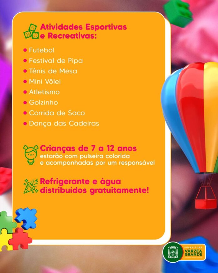 A Prefeitura de Várzea Grande, por meio da Secretaria de Educação, Cultura, Esporte e Lazer (SMECEL) – via Superintendência Municipal de Esporte e Lazer – preparou uma programação especial para celebrar o Dia das Crianças, que será realizado no próximo domingo (12), das 7h30 às 12h, no espaço Seis Campos, localizado na região do Grande Cristo Rei.