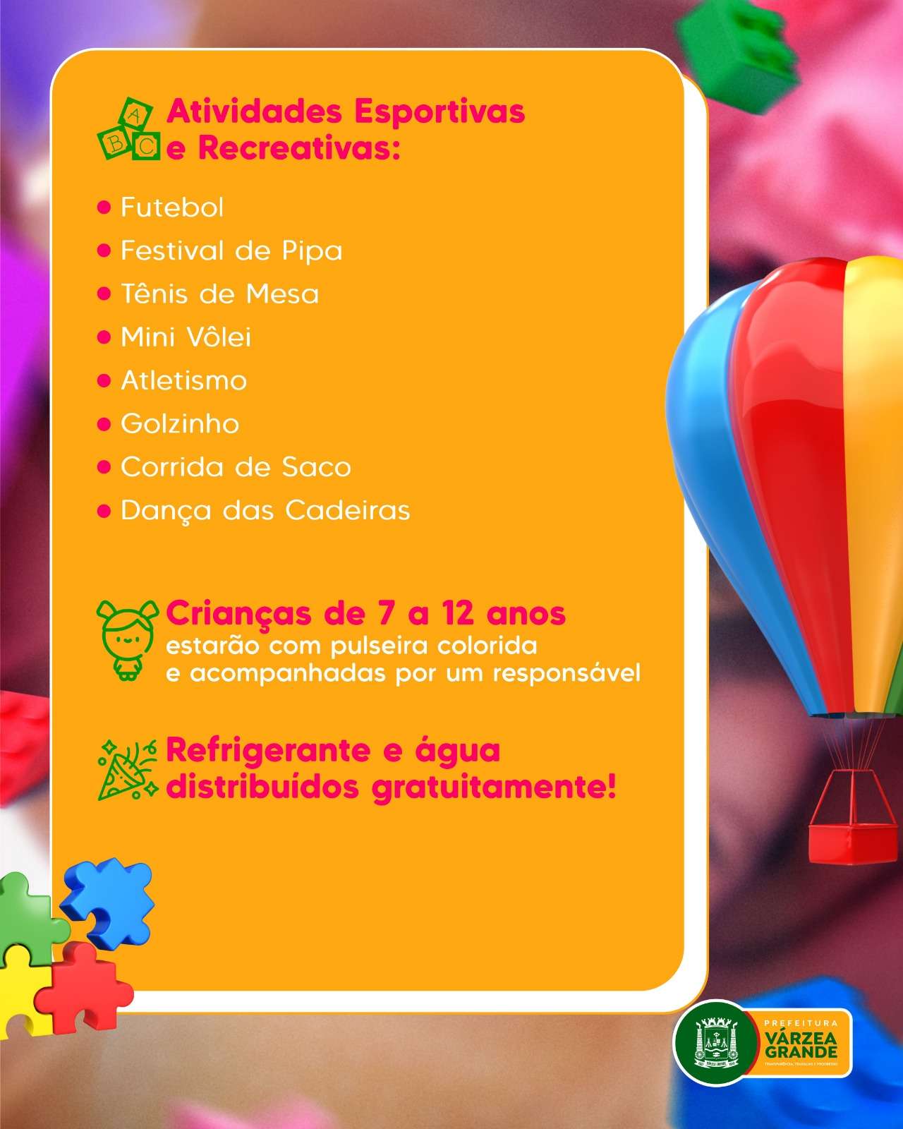 Entre as atrações estão futebol, festival de pipa, tênis de mesa, mini vôlei, atletismo, golzinho, corrida de saco e a tradicional dança das cadeiras, garantindo diversão e interação entre as crianças e suas famílias