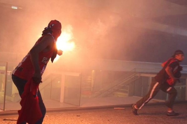 Os vândalos forçaram a entrada pelo portão principal do prédio e quebraram portas de vidro no edifício. Fogos de artifício foram disparados no saguão do prédio.