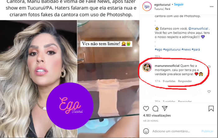 Em seu Instagram, Manu comentou na postagem que tratava sobre a fake news e desmentiu a história: “Quem fez a montagem, caiu por terra pq a verdade prevalece sempre!”, afirmou a cantora. Ela chegou a mostrar o collant que usou na apresentação, para provar que não estava nua.