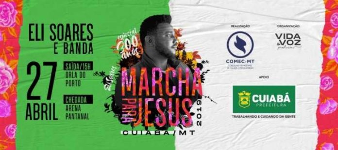 Em celebração aos 300 anos de Cuiabá – comemorados no dia 8 de abril -, o tradicional evento cristão “Marcha para Jesus” (um dos maiores do mundo), acontece neste sábado (27). A expectativa do Conselho de Ministros Evangélicos Cristãos de Mato Grosso (COMEC/MT), que organiza o evento, é manter o público dos últimos anos e reunir 40 mil pessoas. Com apoio da Prefeitura de Cuiabá, a 25ª edição terá o show nacional do cantor Eli Soares e sua banda e demais atrações regionais.