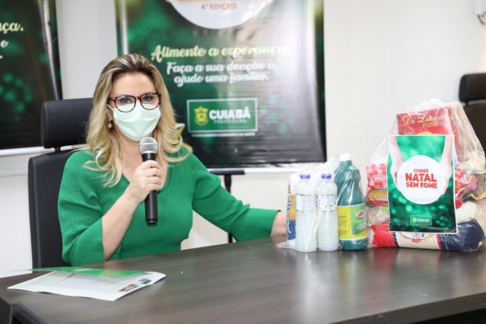 A primeira-dama Márcia Pinheiro deu início, no auditório da Prefeitura de Cuiabá, às doações da campanha de fim de ano “Natal Sem Fome”, destinada a arrecadar alimentos para famílias em vulnerabilidade social. O 4º ano da ação social acontece durante a pandemia de COVID-19, que tem impactado na economia gerando desemprego e aumentando à necessidade de milhares pessoas.