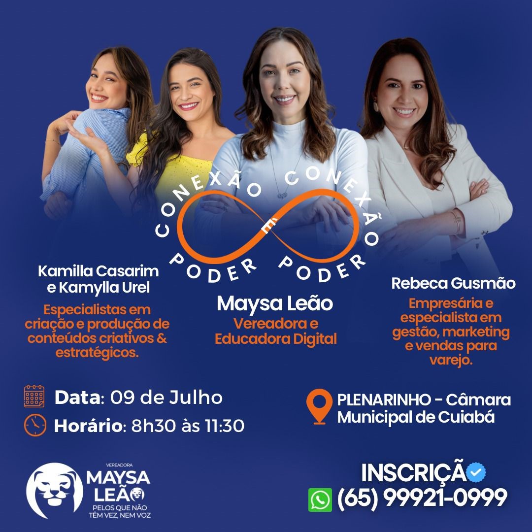 A Câmara Municipal de Cuiabá será palco, no dia 9 de julho, de mais uma edição do “Conexão é Poder”, evento gratuito idealizado e promovido pela vereadora Maysa Leão (Republicanos). Com foco em protagonismo feminino, inovação e desenvolvimento pessoal e profissional, o encontro será realizado das 8h30 às 11h30, no auditório Plenarinho da Casa de Leis, e as vagas são limitadas.