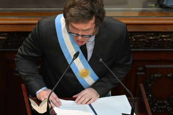 Javier Milei, presidente da Argentina, discursou nesta sexta-feira, 1º, na abertura do Congresso argentino e se referiu aos parlamentares como “casta”. “Eles precisam aceitar que as pessoas odeiam os políticos”, afirmou Milei à imprensa. Milei iniciou seu pronunciamento às 21h00 em vez do meio-dia, como é a tradição, para coincidir com o horário de maior audiência televisiva e em meio a um forte esquema de segurança. Centenas de pessoas se reuniram em torno do Congresso em repúdio às medidas de ajuste do presidente. A Argentina está passando por uma crise econômica com uma inflação interanual de 254% e metade da população vive na pobreza.