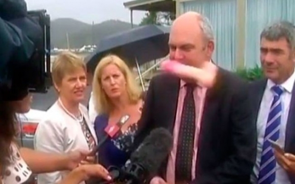 O ministro do Desenvolvimento Econômico da Nova Zelândia, Steven Joyce, foi surpreendido durante uma entrevista ao vivo, em Waitangi, nesta quinta-feira (5), ao ser atingido por um pênis de borracha arremessado por uma mulher. A imagem viralizou nas redes sociais.