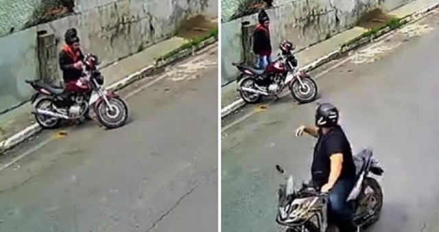 Nas imagens é possível ver que o ladrão, que estava na garupa de uma moto pilotada por uma mulher. Ele desce, vê a moto estacionada e se dirige em sua direção ao veículo. Ele quebra o miolo da ignição da moto e, quando estava quase conseguindo furtá-la, um homem que passava pelo local em outra moto flagra a situação e inibe o crime.