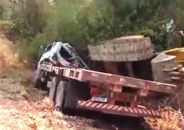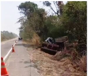 O motorista de um caminhão que transportava uma maquina escavadeira perdeu o controle da direção, saiu da pista e o equipamento caiu da carroceria. O acidente aconteceu na manhã de segunda-feira 09/09 na BR-174 na região de Cáceres, a 220 km de Cuiabá. Apesar do susto, o condutor não teve ferimentos, apenas danos materiais no caminhão.