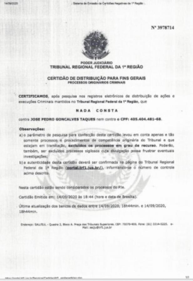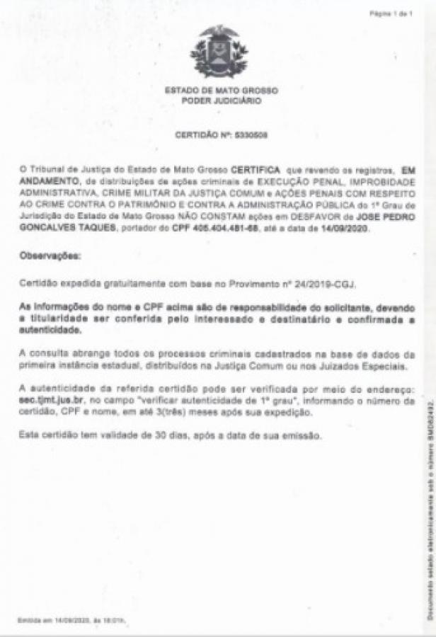 Diante das alegações surgidas nos últimos dias a respeito da sua honestidade e sobre a impugnação de sua candidatura ao Senado Federal, Pedro Taques (Solidariedade) torna público suas certidões negativas criminais.