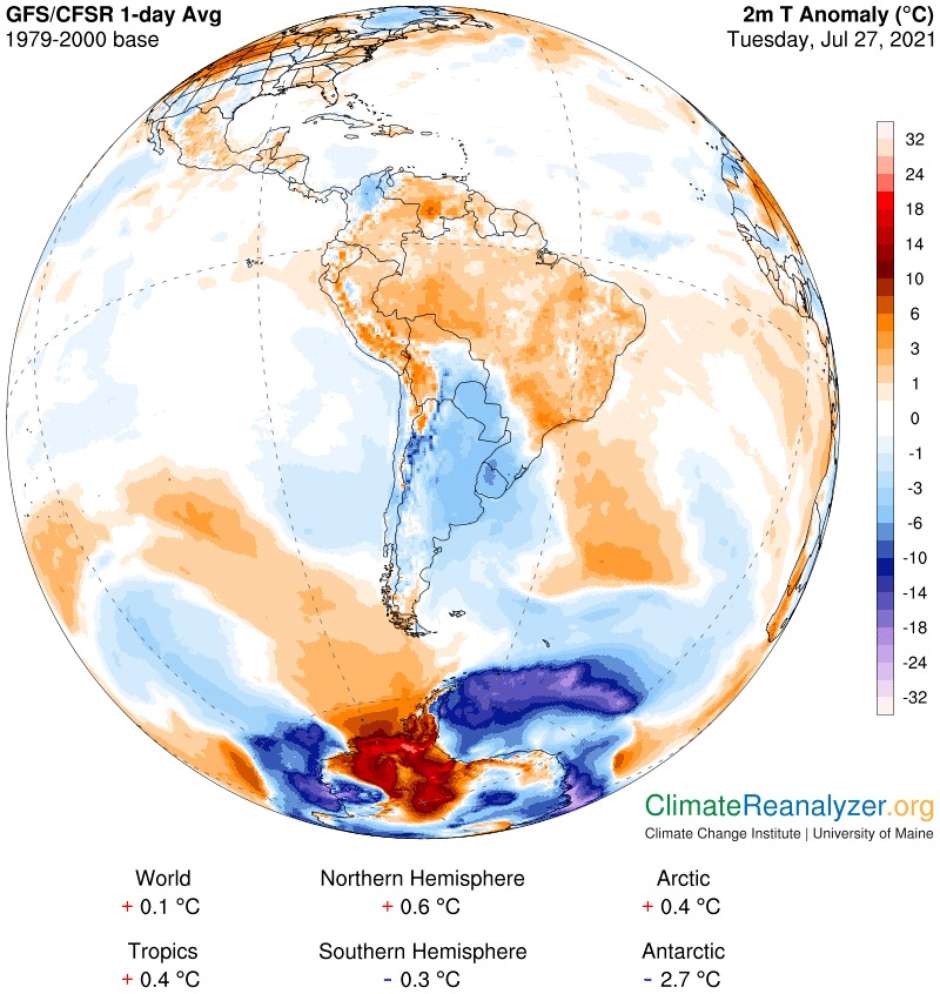 Imagem computadorizada da última terça (27/7) mostra massa de ar quente deixando a América do Sul rumo à Antártida enquanto massa de ar frio deixa a Antártida rumo à América do Sul