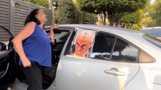 No veículo havia duas fotos de Alexandre de Moraes, uma delas estampava uma cruz invertida na testa do ministro, um símbolo ao satanismo