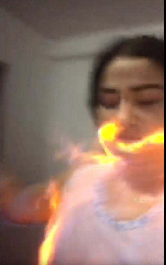 “Sabe o que é isso? Sabe? Isso aqui, sabe?. Eu vou morrer queimada. Tchau”, diz a mulher nos vídeos que aparecem publicados na internet.
