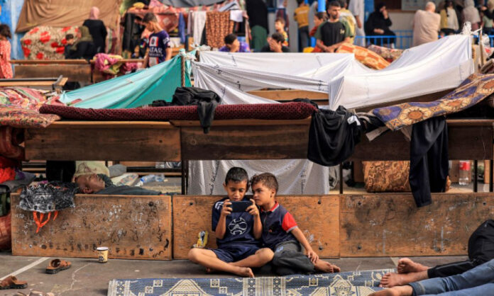 Crianças palestinas deslocadas, que fugiram de suas casas em meio aos ataques israelenses, exibem suas cores de personagem de desenho animado │MOHAMMED ABED / AFP