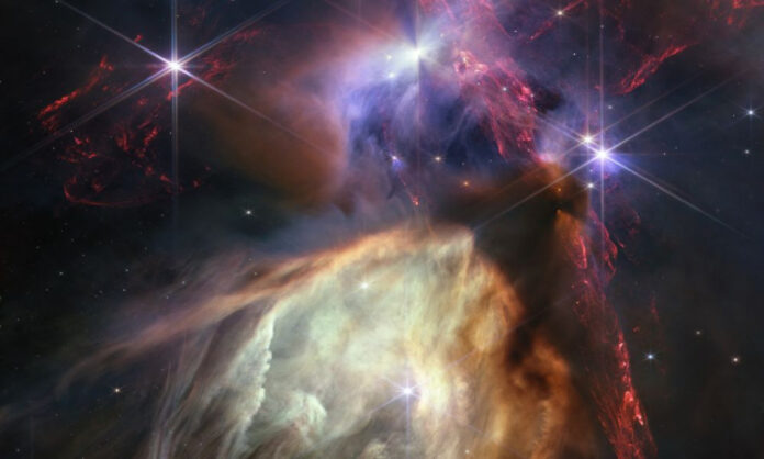 A Nasa divulgou um novo registro único do telescópio espacial James Webb: a imagem do nascimento de estrelas semelhantes ao Sol. Na captura, é possível ver jatos de gás vermelho explodindo no cosmos e poeira incandescente. A foto provém da região de formação de estrelas mais próxima da Terra, a 390 anos-luz, situada na nuvem de gás de Rho Ophiuchi. A imagem, que contém cerca de 50 estrelas jovens de tamanho similar ao Sol, “nos permite ser testemunha de um brevíssimo período do ciclo vital estelar com uma nova clareza”, disse Klaus Pontoppidan, cientista do projeto Webb, explicando que o próprio Sol viveu uma fase como essa “há muito tempo”. A divulgação dessa captura acontece no mesmo dia em que se celebra o aniversário das primeiras imagens do telescópio James Webb.