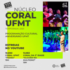 Com 08 vídeos lançados até o momento, o Núcleo segue sua programação digital para celebrar mais um aniversário, desta vez, o da Universidade Federal de Mato Grosso, que em 2021 comemora 51 anos. Para a ocasião, as canções escolhidas foram “Pedra”, de Estela Ceregatti, nas vozes do Coral UFMT, e “Alguém na Multidão”, de Rossini Pinto, pelo Coral da 3ª Idade da UFMT. Os vídeos estarão disponíveis no canal oficial do coro nos dias 10 e 11 de dezembro, às 19h, respectivamente.