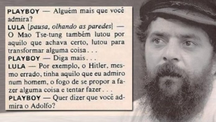 Lula admirava o líder (assassino) alemão … em 1979, o petista deu uma entrevista para a Revista Playboy onde declarava sua ‘simpatia’ pelo nazista … ele elogiou a “disposição, força e dedicação” de Hitler ao declarar: