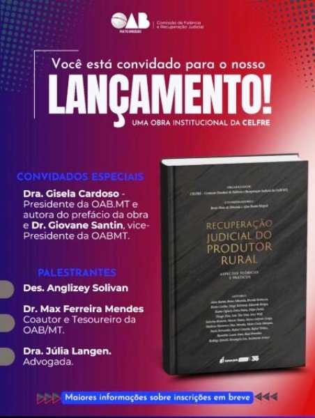 O conselheiro federal da OAB-MT e ex-presidente da Comissão de Falência e Recuperação de Empresa, Breno Miranda, é um dos coordenadores da obra. Ele antecipa que a programação do evento de lançamento contará com debate jurídico sobre o tema e palestras com a desembargadora Anglizey Solivan, o diretor tesoureiro da OAB-MT e coautor Max Ferreira Mandes, além da advogada Julia Langen.