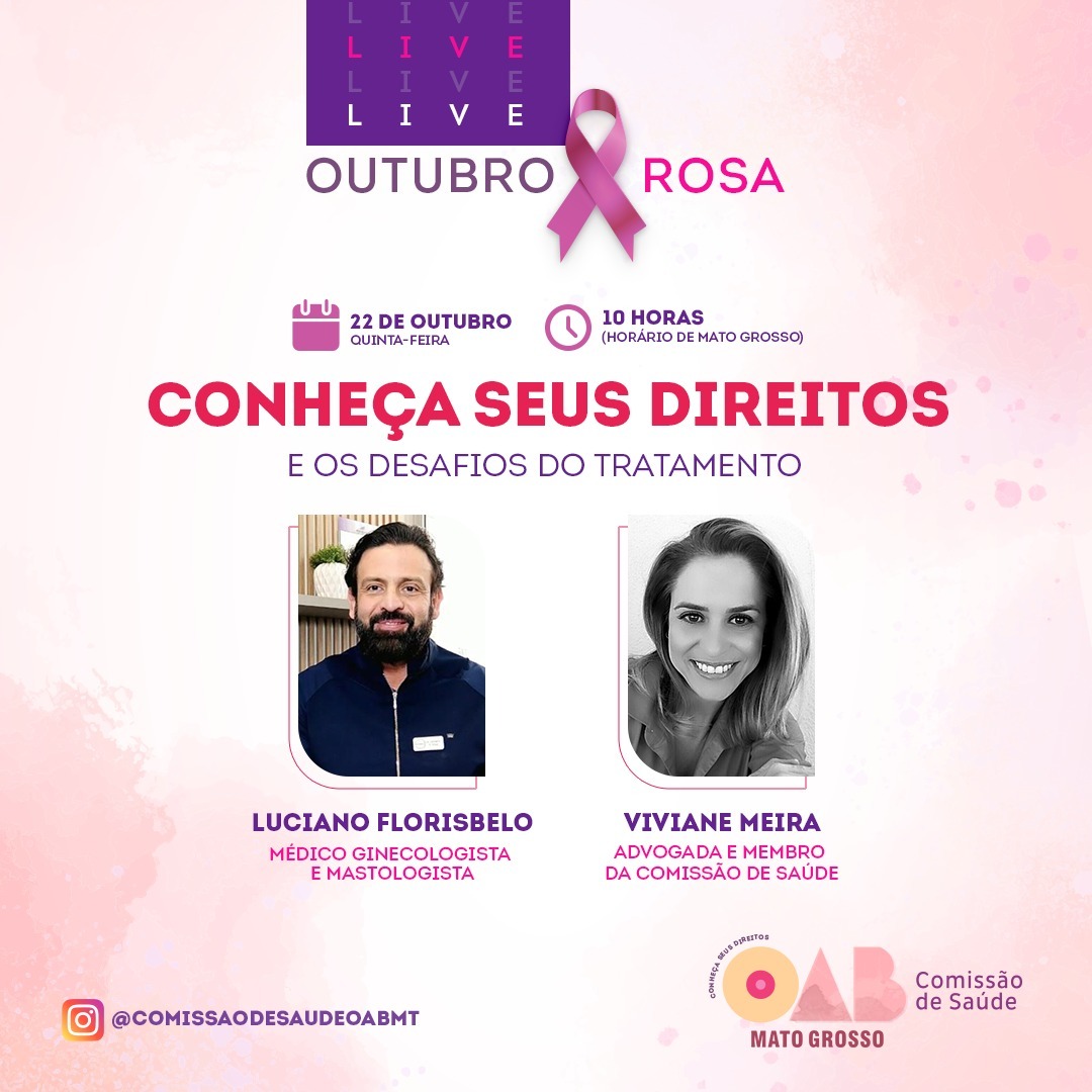 A partir das 10h (horário de MT), via perfil da comissão no Instagram, o oncologista Luciano Florisbelo e a advogada e membro da comissão, Viviane Meira apresentam perspectivas do viés da saúde e do direito, respectivamente. Ainda na ocasião, a Comissão de Saúde lança uma cartilha especial para o período, a “Outubro Rosa – Conheça seus direitos”, como um guia sobre a legislação que atende pessoas em tratamento do câncer. A vice-presidente da comissão, Priscila Aguilar Arruda explica que as ações visam a interdisciplinaridade do tema.