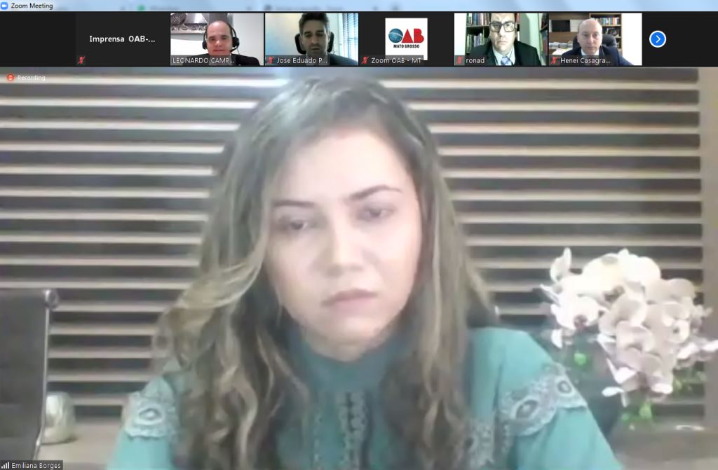 Em reunião histórica a Ordem dos Advogados do Brasil – Seccional Mato Grosso (OAB-MT) realizou ato de desagravo público em favor da advogada Emiliana Borges França. O encontro, primeiro a ser realizado virtualmente pela entidade, aconteceu na 7ª Sessão Ordinária da Primeira Turma Do Conselho Seccional, nesta quinta-feira (29).