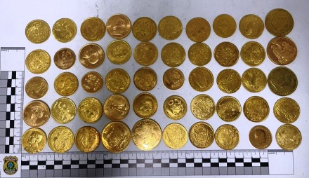 Na bagagem, os fiscais encontraram 50 moedas de ouro de diferentes tamanhos e origens, cunhadas em vários países. O material foi encaminhado à Superintendência da PF, onde passou por testes que confirmaram a autenticidade do ouro.