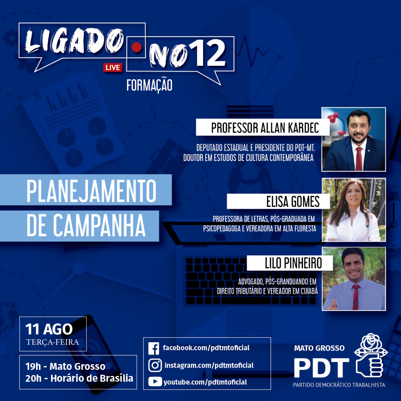 A próxima live de formação será nesta terça-feira (11) às 19h e abordará o Planejamento de Campanha Eleitoral. Entre os convidados, está o vereador por Cuiabá, Lilo Pinheiro, a vereadora de Alta Floresta, Elisa Gomes, e o Deputado Estadual Allan Kardec.