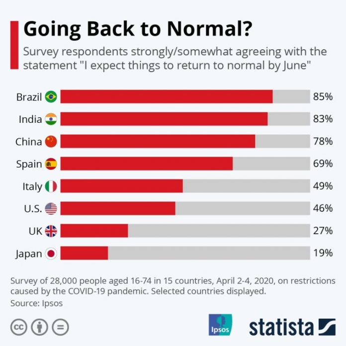 De acordo com uma pesquisa realizada pelo instituto, as percepções sobre quando a sociedade voltará ao normal após a pandemia do vírus chinês diferem amplamente em todo o mundo.