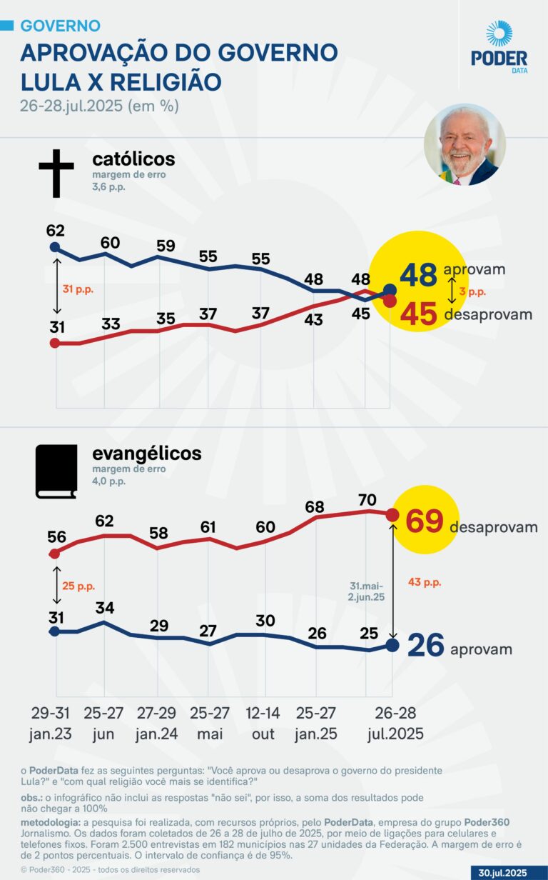A pesquisa do Instituto PoderData mostrou que o governo Lula (PT) é reprovado por larga margem entre evangélicos, enquanto divide os católicos.