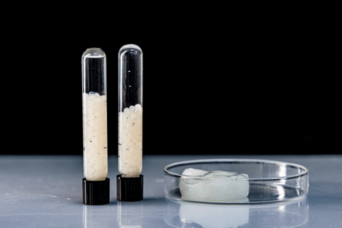 A segunda etapa consiste na aplicação de um processo mecânico de cisalhamento, em que é utilizado um equipamento chamado Grinder. Por meio dele, é obtida a nanofibrila de celulose, que tem aparência de um gel translúcido. A próxima etapa é a formulação do hidrogel. O material obtido no Grinder é combinado com alginato de sódio (um biopolímero que confere resistência e otimiza a absorção de água) e então submetido a processos de reticulação iônica (que ocorre quando cadeias poliméricas são ligadas por meio de interações iônicas, formando uma estrutura tridimensional) com cloreto de cálcio, formando discos e microesferas de hidrogel.