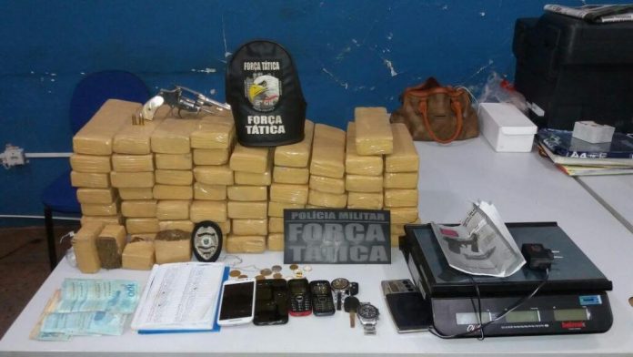 Uma guarnição que realizava patrulhamento na região abordou um carro com as mesmas características. No veiculo estavam Mayara Stephany da Silva, de 22 anos, e o condutor Willian Santos Nascimento de Souza, de 28 anos. Em busca no interior do carro os policiais encontraram 40 tabletes de maconha atrás do banco traseiro. Já no porta luva havia um revólver calibre 32.
