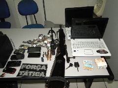 Na casa do suspeito, os policiais apreenderam um rádio de comunicação motorola com rastreador e dois carregadores, um fuzil 762 com oito munições, R$ 10 mil reais em dinheiro, uma TV LCD, duas máquinas fotográficas, dois notebooks, celulares e relógios.