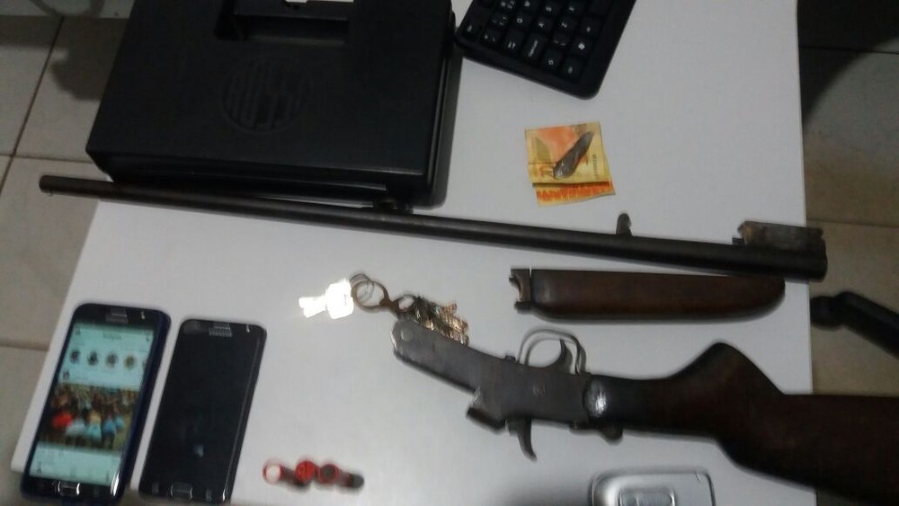 Os policiais foram até à casa do suspeito, mas não o encontraram. No local, porém, os PMs apreenderam porções de drogas, uma espingarda calibre 32 e munições, além de eletrodométicos sem nota fiscal que estavam com outras pessoas.