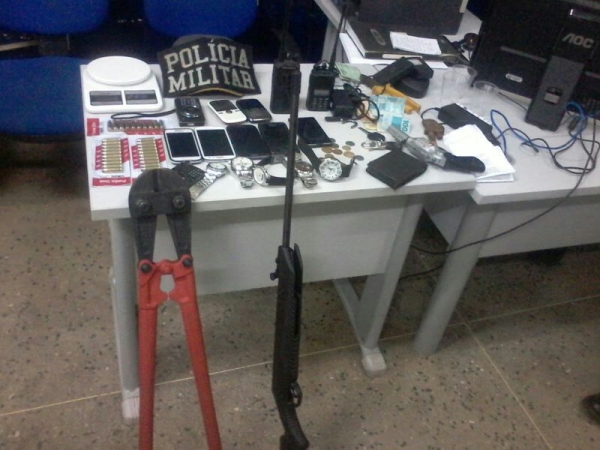 Policiais Militares do 25° Batalhão, prenderam quatro suspeitos com idade entre 18 e 21 anos e apreenderam dois adolescentes de 15 anos. Com o bando foi recuperado 2 rádios de comunicação na frequência da Polícia Militar, 50 munições de calibre 22, 30 munições de calibre 38, uma balança de precisão, uma espingarda de pressão e um simulacro de revólver.