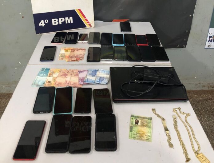 Dois homens, de 29 e 41 anos, foram presos na noite desta terça-feira (29.08), suspeitos por roubo a mão armada e receptação, no bairro Dom Aquino, em Cuiabá. Na ação, policiais militares do 4º Batalhão apreenderam 24 aparelhos celulares, um notebook, mais de R$ 300, duas pulseiras e uma corrente.